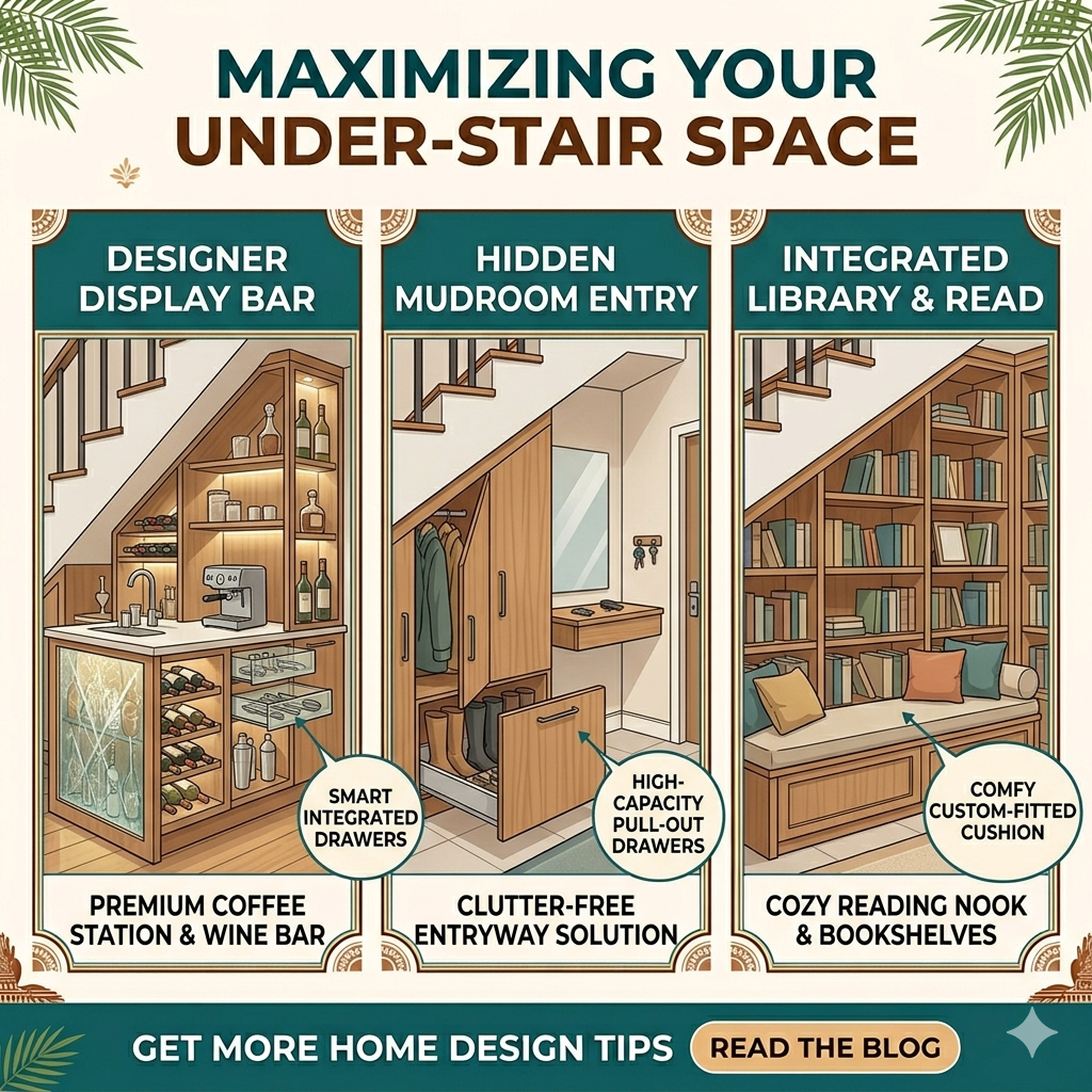 In modern home design, every square inch counts. Whether you are building a new house in Kerala or renovating an older one, one of the most frequently overlooked areas is the under-stair space. Often relegated to being a dark corner for dusty suitcases or old newspapers, this small nook actually holds immense potential to enhance both the functionality and the aesthetic appeal of your home.